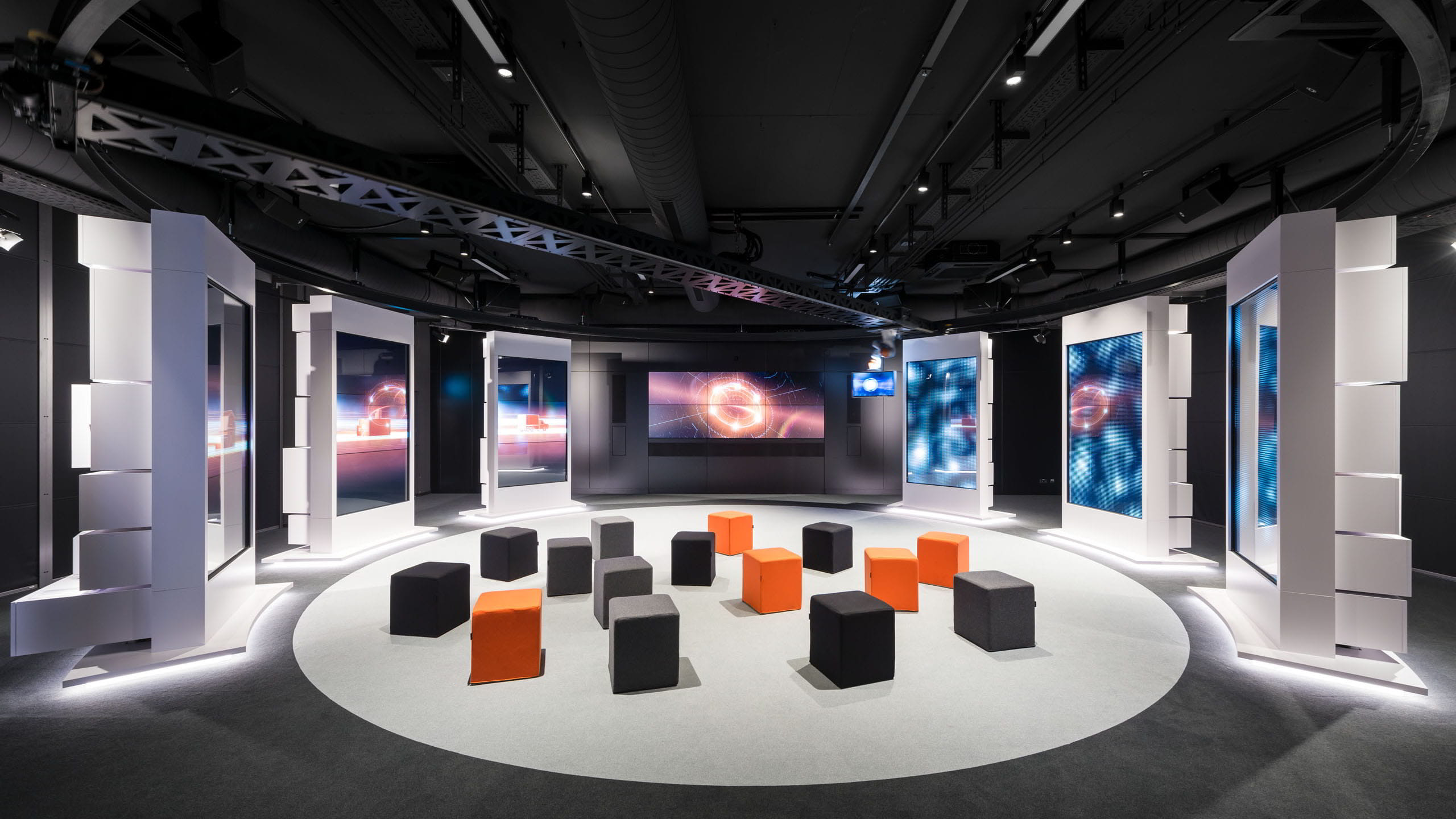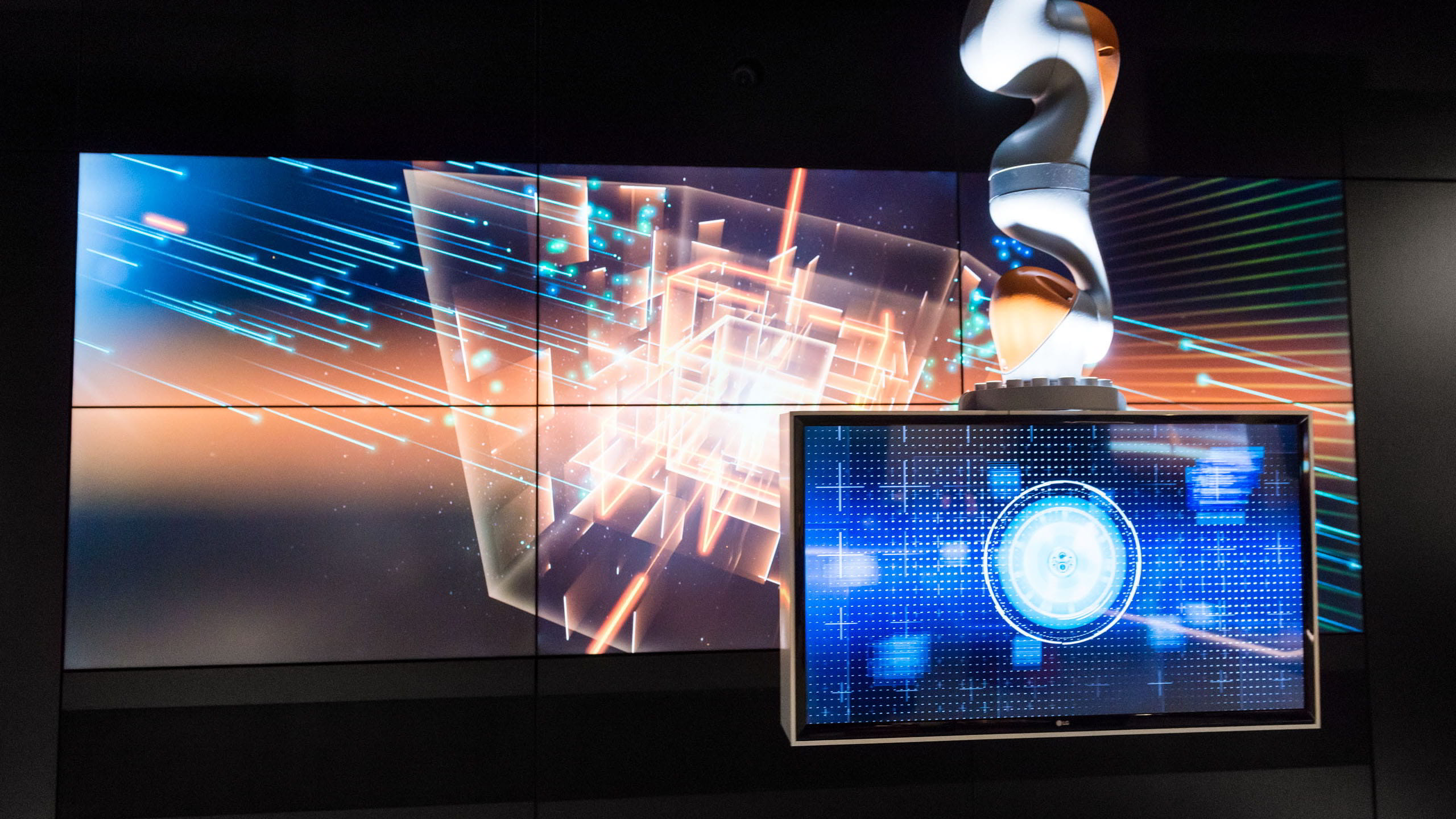 Interactive audio visual installation, which included an LED wall, an industrial robot mounted on a spinning track and six LED columns distributed around the room, all synched to one another.